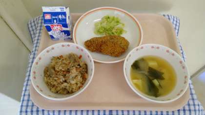 五目ご飯の具は鶏肉・ごぼう・人参・こんにゃく・干し椎茸です。白身魚のごまフライは「ごま入り小麦粉」にくぐらせてから「ごま入りパン粉」をまぶして揚げます。