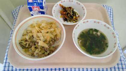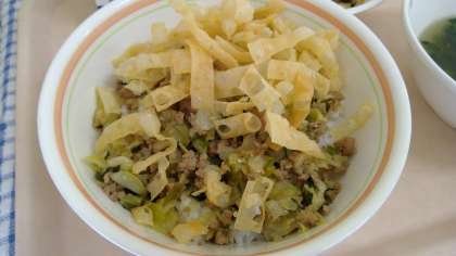11月24日(木)の献立 公開日 2022/11/24 更新日 2022/11/24 今日の給食 ・食べたら餃子丼 ・牛乳 ・海藻サラダ ・春雨スープ 食べ餃丼は、炒めた餃子の具と揚げた皮を乗せた丼です。給食室には鉄板がないので焼き料理ができません。調理機器は限られていますが、各校の給食室は色々工夫をして献立を立てています。 食材産地 にんにく 青森 生姜 高知 キャベツ 愛知 ニラ 茨城 人参 千葉 玉ねぎ 北海道 小松菜 茨城 豚肉 茨城