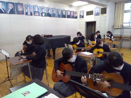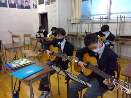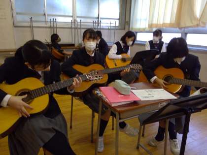 1年生、ギターに挑戦! 公開日 2022/11/25 更新日 2022/11/25 お知らせ 今1年生の音楽の授業では、ギターに取り組んでいます。初めて触る生徒がほとんどで、コードを押さえるのがとても難しいようです。今日は3つのコードを使った『Happy Birthday』に挑戦しました。最後には、なんとか弾けるようになった人もいるようです。次回はどんな曲に挑戦するのかな?