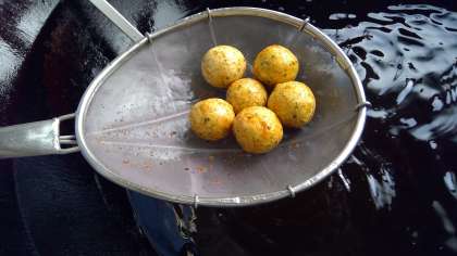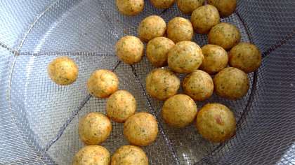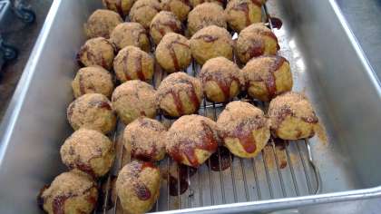 芋餅のたこ焼き風です。仕上げにソースとかつお節をかけます。