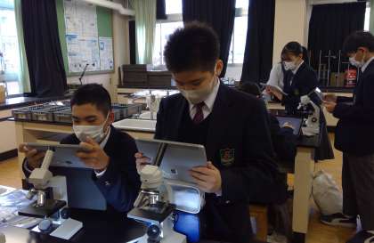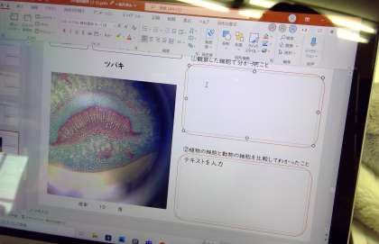 生物の細胞を顕微鏡で観察するだけでなく、タブレットのカメラを使って撮影した画像をTeams上でクラス共有しています。