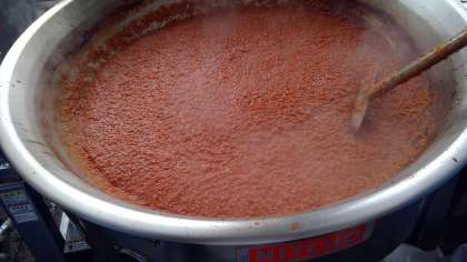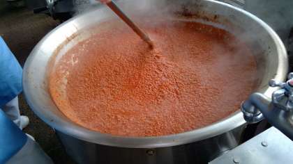ミートソースには大量の野菜が入っています。今日は玉ねぎ・人参・しめじ・セロリ・トマトピューレを使用しました。始めは60キロあった材料も40キロまで減ります。野菜の水分だけで煮つめるのがポイントです🍅焦げ付かないように常にかき混ぜながら、気の抜けない調理です。