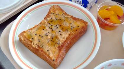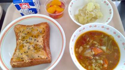 今日は渋谷ワンダフル給食です。タイのエビパンを作りました。パンにエビのすり身を塗って揚げた料理です。仕上げにスイートチリソースをかけています。リヨネーズとはフランスのリヨン風という意味だそうです。
