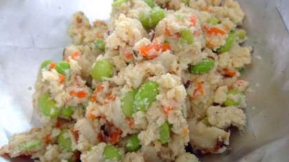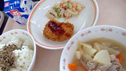 2月21日(火)の献立 公開日 2023/02/21 更新日 2023/02/21 今日の給食 ・ご飯 ・牛乳 ・いかフライ ・ちりめんふりかけ ・卯の花 ・豚汁 おから(雪花菜)はたんぱく質と食物繊維が豊富です。給食ではひき肉料理に混ぜることもありますが、今日は卯の花にしました。水分を飛ばしすぎないのがポイントです。 食材産地 人参 千葉 大根 千葉 じゃが芋 長崎 玉ねぎ 北海道 枝豆 タイ しらす 茨城 いか ペルー 豚肉 茨城