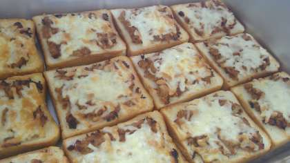 今日はパン屋さんです。甘辛味のツナ・チーズをのせて、焼いています。
