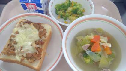 3月1日(水)の献立 公開日 2023/03/01 更新日 2023/03/01 今日の給食 ・照りツナトースト ・牛乳 ・ポトフ ・ブロッコリーサラダ 「照りツナトースト」甘辛味のツナチーズトーストです。ブロッコリーは冬が旬です。みっちりした立派なブロさんが届きました🥦 食材産地 にんにく 青森 人参 千葉 玉ねぎ 北海道 じゃが芋 鹿児島 キャベツ 愛知 セロリ 静岡 ブロッコリー 愛知 鶏肉 岩手