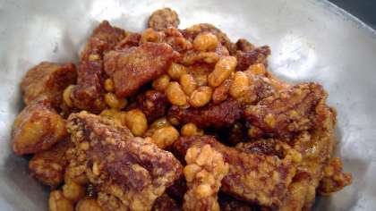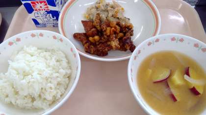 4月20日(木)の献立 公開日 2023/04/20 更新日 2023/04/20 今日の給食 ・ご飯 ・牛乳 ・豚肉のかりん揚げ ・卯の花 ・味噌汁 【豚肉のかりん揚げ】角切りの豚肉に下味をつけ、片栗粉をまぶして揚げます。みりん・酒・砂糖・醤油のタレにからめて出来上がりです。 🍙米飯は1学年で1釜、計3釜で炊飯しています🍙 食材産地 人参 徳島 さつま芋 千葉 玉ねぎ 佐賀 豚肉 茨城 大豆 北海道