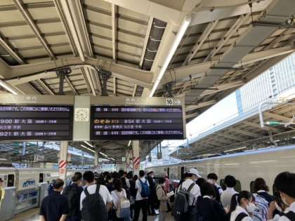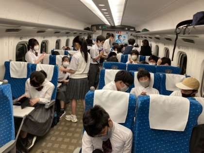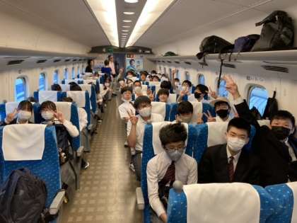 修学旅行#2 公開日 2023/05/21 更新日 2023/05/21 3年生 3年生を乗せた新幹線ですが、ただいま三島を過ぎたあたりです。 座席を回転させてトランプをしたり、外の景色を眺めたり、みんな思い思いに過ごしていますが、残念ながら富士山は雲の中…。 このあと10時過ぎに少し早めの昼ご飯です。
