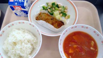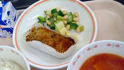 5月22日(月)の献立 公開日 2023/05/22 更新日 2023/05/22 今日の給食 ・ご飯 ・牛乳 ・豚肉のチーズ焼き ・ビーンズサラダ ・トマトスープ 豚肉は塩麴で味付けをして、上に粉チーズとパン粉をかけて焼きました。トマトスープは酸味がまろやかになるように、トマト以外の野菜もたくさん入れて煮込んでいます。 食材産地 きゅうり 群馬 じゃが芋 長崎 にんにく 青森 人参 徳島 玉ねぎ 佐賀 枝豆 タイ 大豆 北海道 豚肉 茨城