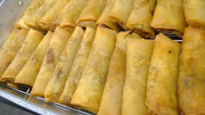 【切干春巻】切干大根・豚肉・干し椎茸を使った春巻です。切干大根はカルシウムが豊富です。給食では春巻の他に、煮物・汁物・和え物と様々な料理で使用します。