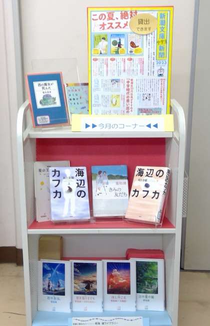 司書の先生が今月のおすすめの本を展示しているコーナーが図書館カウンター横にあります。前期中間考査前ですが、勉強の合間の気分転換にいかがですか?