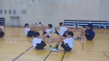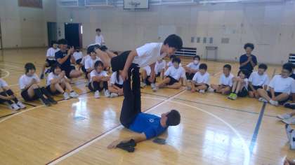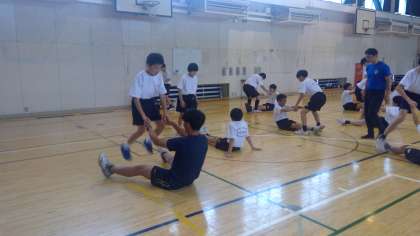 本日は日本体育大学の三宅先生による体つくり運動の特別授業。学生の方にも来ていただいています。運動・食事・睡眠の大切さを教えていただき、様々な運動にチャレンジ!