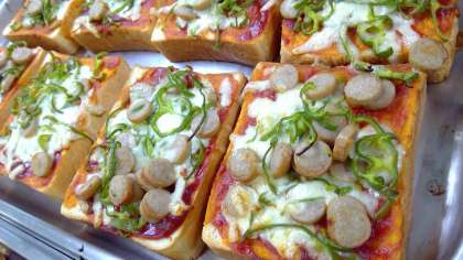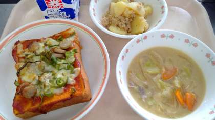 10月27日(金)の献立 公開日 2023/10/27 更新日 2023/10/27 今日の給食 ・ピザトースト ・牛乳 ・ツナポテトソテー ・豆乳味噌スープ 【ピザトースト】ケチャップ・ウスターソースを合わせてパンに塗り、ピーマン・ウインナー・チーズをのせて焼きました。 食材産地 ピーマン 茨城 にんにく 青森 じゃが芋 北海道 キャベツ 千葉 玉ねぎ 北海道 人参 北海道 豚肉 茨城