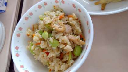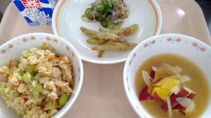 【きつねご飯】全校生徒のリクエストメニューです。きつねご飯は油揚げ、たぬきご飯は天かすとしてアンケートを実施しました。