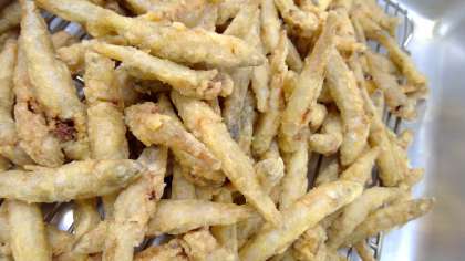 【わかさぎカレー揚げ】わかさぎは塩・カレー粉で味をつけてから、片栗粉をまぶして揚げました。