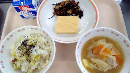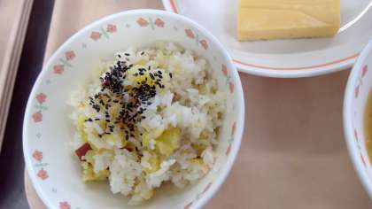 【さつま芋ご飯】酒・塩・さつま芋を入れて炊きました。仕上げに黒ごまをふっています。