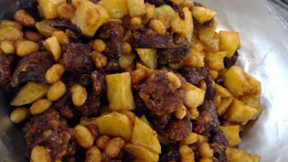 【レバポテビーンズ】鶏レバー・ハツを酒・にんにく・生姜に漬けます。片栗粉をつけて揚げ、合わせ調味料で味付けて完成です。お肉屋さんがハツを丁寧に開いて下さるので、しっかり血抜きがしてあります☺
