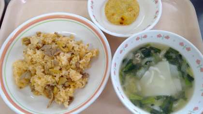 11月25日(土)の献立 公開日 2023/11/25 更新日 2023/11/25 今日の給食 ・キムタクご飯 ・じゃがもち ・餃子風スープ 【キムタクご飯】キムチ・たくあん・豚肉を使った混ぜご飯です。 【じゃがもち】じゃが芋をやわらかく蒸して、片栗粉・塩・コーンをよく混ぜて丸めて揚げました。 食材産地 小松菜 埼玉 じゃが芋 北海道 にんにく 青森 白菜 茨城 ニラ 栃木 豚肉 茨城