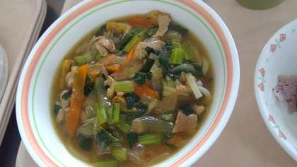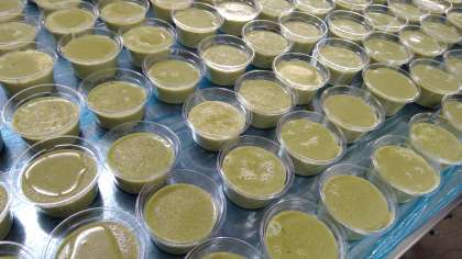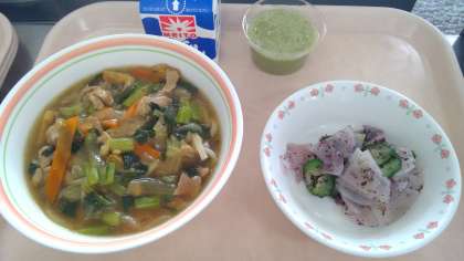 カレーうどんは普段の汁物より濃い出汁をとって作ります。カレー粉が入ってもしっかり出汁の味がするように仕上げるためです。抹茶ミルクプリンは豆乳とアガーを使っています。抹茶は溶けにくいので、温めた豆乳で少しずつ伸ばしていきます。