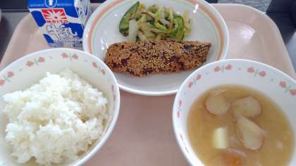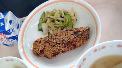 2月15日(木)の献立 公開日 2024/02/15 更新日 2024/02/15 今日の給食 ・ご飯 ・牛乳 ・𩸽の利休揚げ ・塩昆布和え ・味噌汁 𩸽は分厚い皮が特徴的ですが、揚げるととても食べやすくなります。利休揚げにする時は、ごまをまぶしてから粉をつけるのがポイントです🐟 食材産地 白菜 茨城 きゅうり 群馬 じゃが芋 鹿児島 玉ねぎ 北海道 ホッケ ロシア いんげん タイ