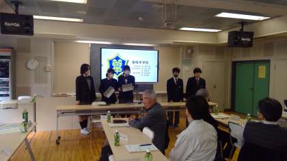 学校運営協議会にて 公開日 2024/02/17 更新日 2024/02/17 お知らせ 本日は学校運営協議会がありました。生徒会が、生徒会の取り組みについての説明をしました。委員の方にも感想をいただき、充実した時間となりました。