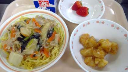 昨日の暖かさから一転、一段と冷え込みました。今日は豚肉と野菜をたっぷり使用したあんかけ焼きそばです。給食室の室温も10度ほどになるので、冬場は冷めにくい献立を組むことが多くなります。