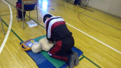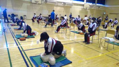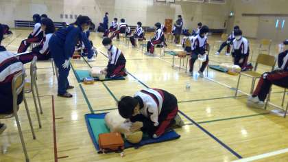 本日の1〜3時間目は普通救命救急講習です。渋谷消防署の方にご指導いただいています。