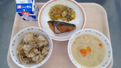 4月17日(水)の献立 公開日 2024/04/17 更新日 2024/04/17 今日の給食 ※今年は新筍が例年より早く終了するとの事で、来週23日(火)に予定していた筍ご飯を本日提供しました。 ・たけのこご飯 ・牛乳 ・鯖の幽庵焼き ・春雨炒め ・ミルク味噌スープ 鯖の幽庵焼きは「酒・みりん・醤油・柚子果汁」に漬けて焼いています🐟