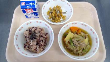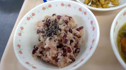 今日は進級祝いで赤飯を炊きました。本来はもち米100%で蒸す料理ですが、笹塚の給食ではうるち米と1:1にして炊飯釜で炊いています。