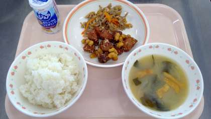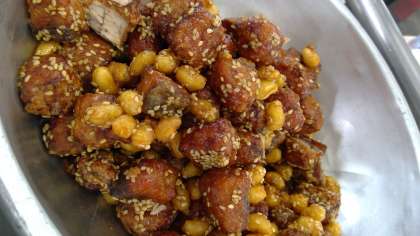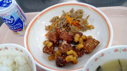 【鰹のごまがらめ】角切りの鰹と大豆に片栗粉をまぶします。揚げてよく油をきり、調味料・炒りごまと合わせて完成です。大豆はしっかり浸水をすると下茹で不要です。鰹と大豆で鉄分が豊富なメニューです。