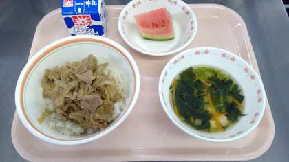 4月30日(火)の献立 公開日 2024/04/30 更新日 2024/04/30 今日の給食 ・豚ごぼう丼 ・牛乳 ・すまし汁 ・果物(すいか) 【豚ごぼう丼】豚肉・ごぼう・玉ねぎ・こんにゃくを使った甘辛丼です。 【すいか】何だか早いように感じますが、ちょうど今頃から小玉すいかが出始めるそうです。今日は群馬県産の小玉スイカが届きました🍉