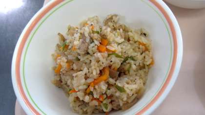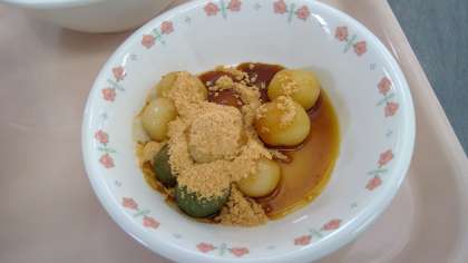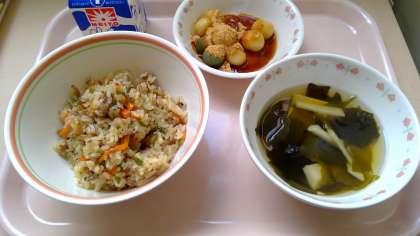 5月2日(木)の献立 公開日 2024/05/02 更新日 2024/05/02 今日の給食 ・五目ご飯 ・牛乳 ・若竹汁 ・黒みつきな粉白玉 【五目ご飯】今日の五目は鶏肉・人参・こんにゃく・いんげん・干し椎茸です。干し椎茸は(苦手な生徒も多く…)みじん切りにして加えています。最後に少量のごま油を合わせて仕上げます🍚 【黒みつきな粉白玉】給食室では1人分×クラス人数で分配して、均等になるように調理します。みんなの熱い視線に給食当番さんも少し緊張です🍡