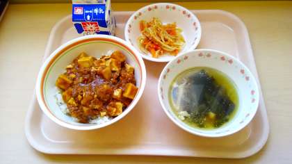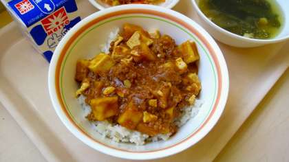 【麻婆豆腐丼】本校では絹豆腐と高野豆腐を使用しています。高野豆腐は水で戻して軽く絞り、片栗粉をまぶして揚げました。揚げ高野は他に汁物や揚げだし豆腐にもおすすめです。