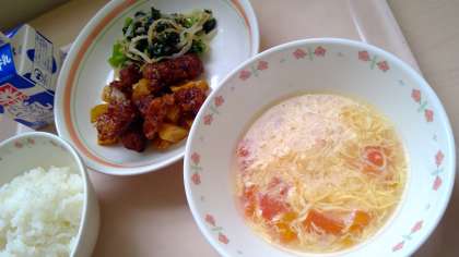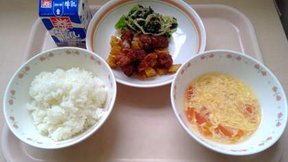 5月13日(月)の献立 公開日 2024/05/13 更新日 2024/05/13 今日の給食 ・ご飯 ・牛乳 ・黒酢酢豚 ・青菜のナムル ・トマト卵スープ 【黒酢酢豚】黒酢は米酢より酸味がおだやかなのが特徴です。本校ではドレッシングでは米酢、酢豚では黒酢を使用しています。