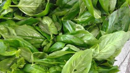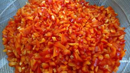 今日はパプリカ・ピーマン・バジルを使います。 大量の野菜を角切りにしていきます。