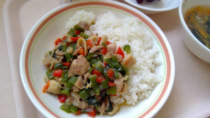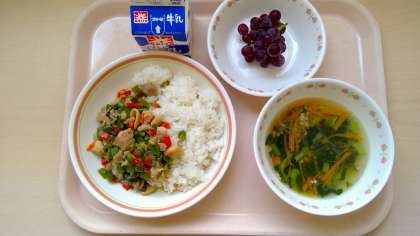 7月3日(水)の献立 公開日 2024/07/03 更新日 2024/07/03 今日の給食 ・ガパオライス ・牛乳 ・春雨スープ ・デラウェア ガパオライスの味付けはナンプラーとオイスターソースです。タイではホーリーバジルというバジルを使用するようですが、今日はスイートバジルを使用しました。ほのかに爽やかさが感じられる仕上がりになりました。 デラウェアは山梨県から届きました🍇