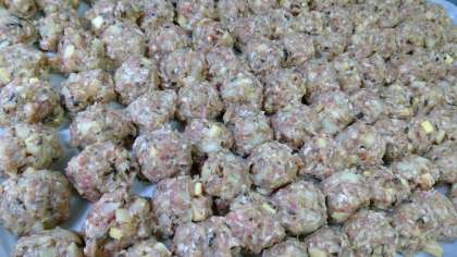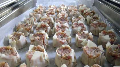 豚肉・玉ねぎ・椎茸・筍を混ぜて丸めます。皮に包んで何を作っているでしょう。