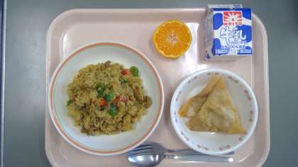 サモサはインド料理です。じゃが芋・玉ねぎ・ひき肉などを炒めた具が入っています。運動会予行お疲れさまでした。体調管理をして、本番に向けて頑張りましょう。