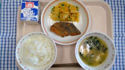今日は日本料理「五福来」関敏雄さんからレシピ提供を受けた献立です。鰆は醤油に漬けて粉をまぶして揚げました。人参おろしを使った和え物はきれいな色です。色々な食品を食べて、体調管理を心掛けましょう。