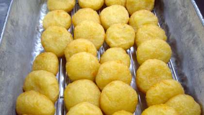 じゃがもちは、茹でたじゃが芋を熱いうちにつぶして、片栗粉と塩を混ぜて丸めます。今日のうどんは肉うどんだったので、豚肉と野菜がたくさん入ったつゆです。