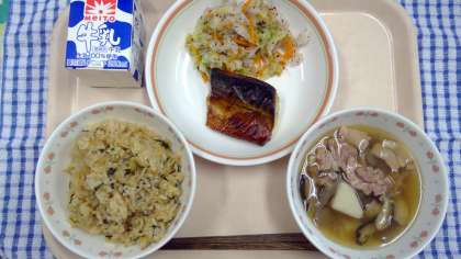 今日の大根飯は大根の葉が手に入らなかったので、小松菜を使用しました。鯖はみりんと醤油に漬けて焼いてあります。芋煮は色々な種類があるようですが、豚肉・醤油味にしました!