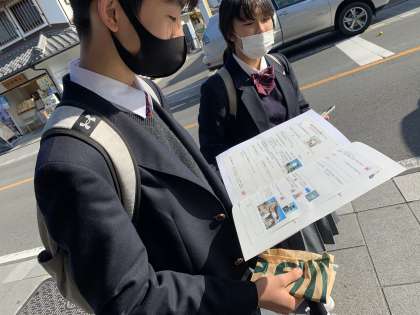 蔵づくりの街並みで見かけた生徒は、とても楽しそうです!! 課題のクイズにも、真剣に取り組んでいます。