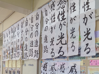 書き初め作品の各教室での展示が始まりました。緊急事態宣言で保護者の皆様の参観はできませんが・・・雰囲気だけお届けします。個性あふれる「力作」が多く見応えがあります。