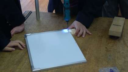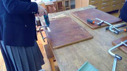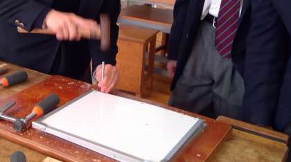 金属加工の授業の様子です。自分の作業が早く終わった生徒は、「ティーチャー」として他の生徒に作業のコツを教えています。