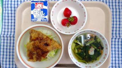 明日明後日は都立推薦入試なので、ソースカツ丼で応援です🍚ご飯にキャベツとカツをのせて食べます。よく噛んで食べましょう🍚