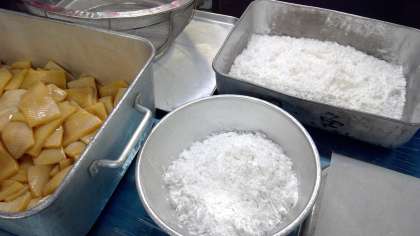 何かに片栗粉をつけて揚げます。さて何でしょう?