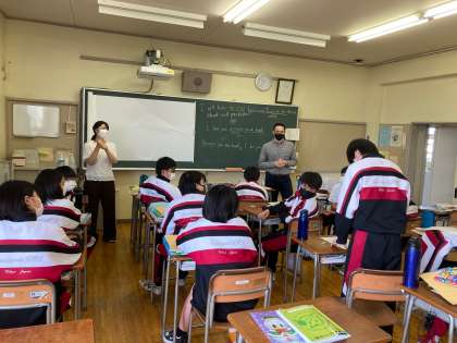 今週は、ALTの先生と英語を学びました。自己紹介では先生の母国であるアメリカのことや好きな食べ物、好きなスポーツ、生徒からの質問にも答えていきました。本日の写真は、2年生のクラスです。「because」の使い方を学びました。無人島で電話も使えない、食べ物もない…そんな状況でみんなだったら何を持っていく?という質問の答えをそれぞれ考えます。