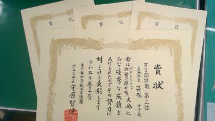 5月16日(日)と5月30日(日)2日間に分けて渋谷区選手権大会がおこなれました。今回も笹塚中は大健闘。団体戦では3位。個人戦ではシングルスで佐藤ひよりさんが優勝。ダブルスでは後藤愛実・日野桃花ペアが3位。今回の試合では、何よりも、全員が一回戦を突破しました!本当によく頑張りました。