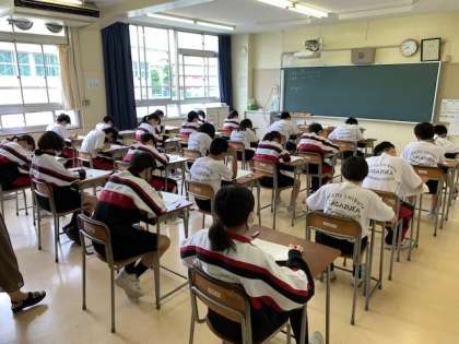 本日は前期の中間考査1日目でした。数学と英語です。写真は1年生の様子です。中学生になって初めての定期考査です。真剣に取り組んでいました。