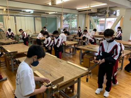 1学年技術、のこぎりの使い方を練習しています。だんだんと慣れて上手に扱えるようになってきました。